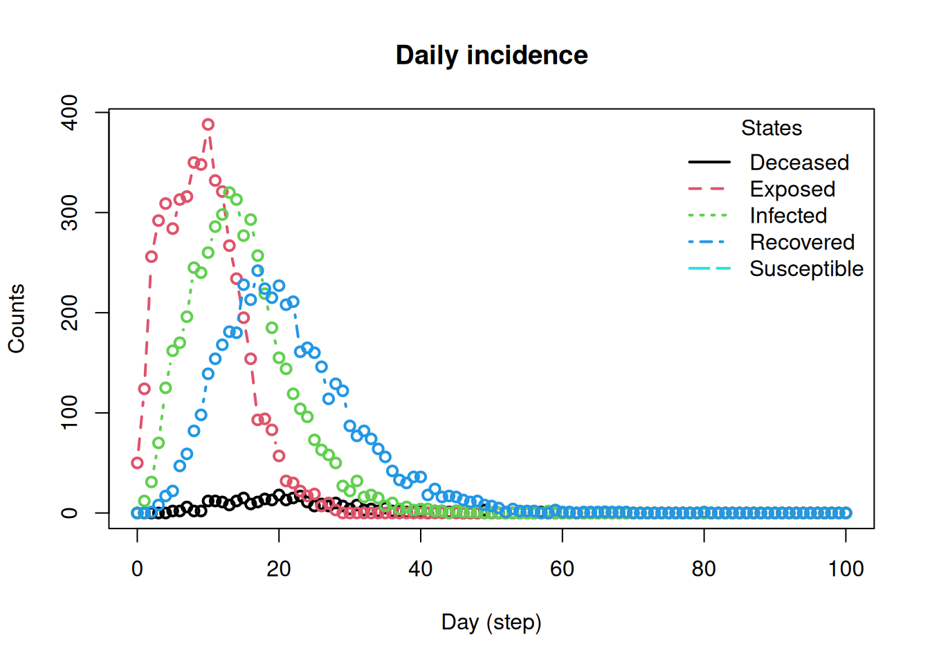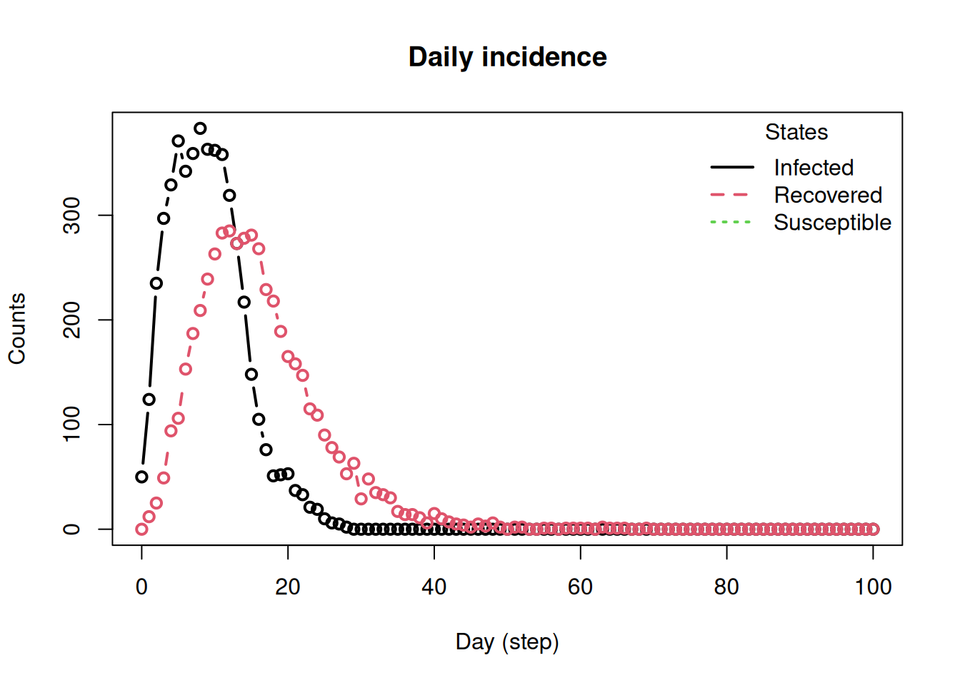 run(sir_builder, ndays = 100, seed = 1912)