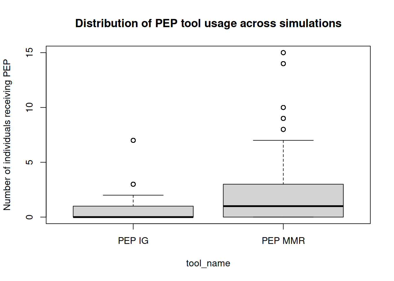 We can also inspect the usage of the PEP tool across simulations. The tool_hist data frame contains the history of tool usage across states. Since IG may be removed from the toolset after its half-life, we will extract the maximum number of each tool used across time steps for each simulation to analyze the overall usage of PEP (both MMR and IG) during the simulations: