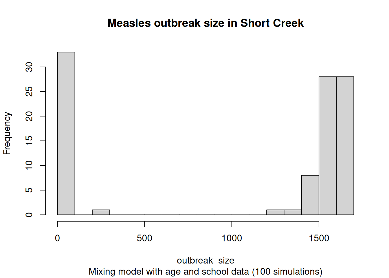 Ultimately, based on the current results, we would be expecting all unvaccinated individuals to become infected, with a small number of vaccinated individuals also getting infected. This is consistent with the high R0 of measles and the low vaccination rates in the area.
