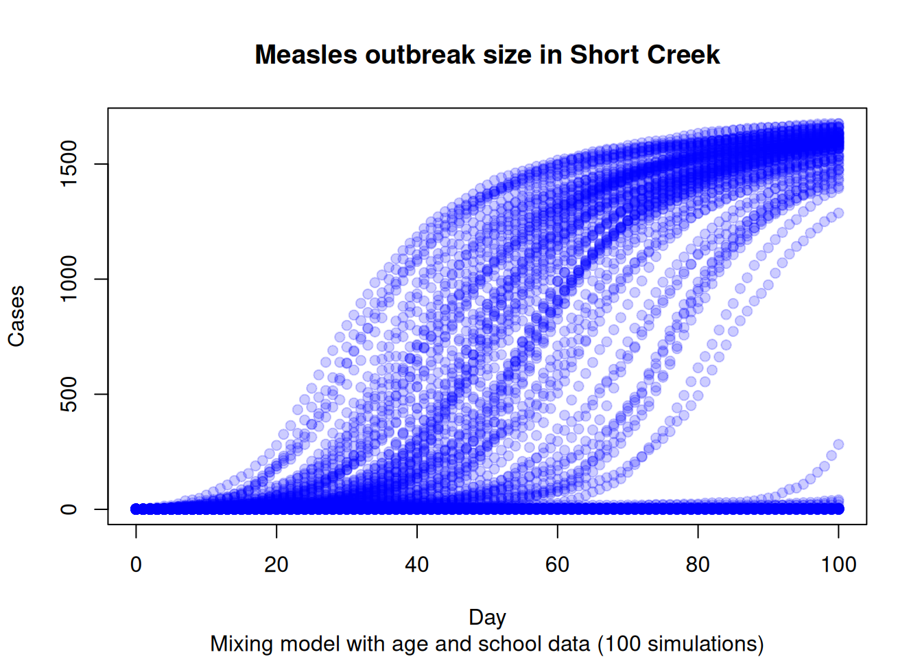 During the 2025 US Measles outbreak, the number of cases in the state of Utah started to climb quickly in the Short Creek region (on the Utah-Arizona border). This vignette shows how we can use the mixing model of the measles R package to do scenario modeling of the situation using both age and school data.